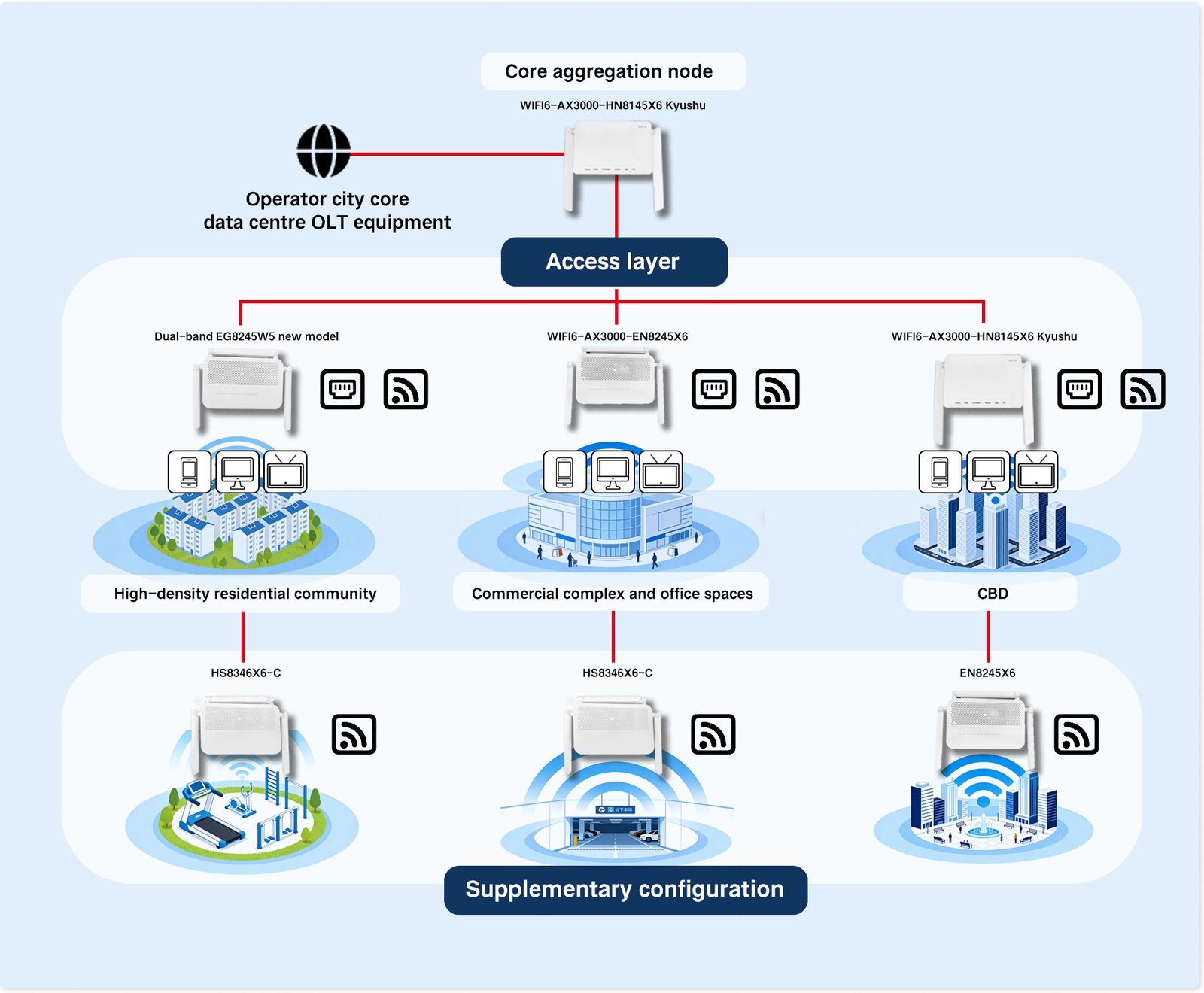 Customised topology and product configuration for three mainhigh-density scenarios, QianzhiDa's full-chain products accu-rately match the environment and network requirements of dif-ferent scenarios, improving network adaptability by over 40%.