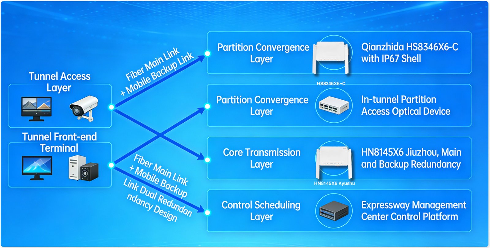 This solution is specifically designed for highway tunnel scenarios, focusing on key scenarios such as single-bore tun-nels twin-arch tunnels, and tunnel clusters Leveraging Clanzhi’score products incuding optical modems,industit-l-grade corrosion-resistant and shockproof housings, and high-gain anti-interference antennas, it establishes a1our-levelall-optical network architecture of front-end terinal – zonalaces – coretransmission – management andscheduling'”. The solution centers on “high stability and redundancy,interference and weather resistance, emergencypriority, and centralised management’, and is compatible with diverse services such as tunnel monitoring, emergencybroadcasting. trafic guidance.,wired interoom and fire alarms t addresses chalenges ke signal bstruction in tunelnvironments requent equipmentalures, and interruptions in emergency communication, providing relable networsupport for the sale operation of highway tunnels.